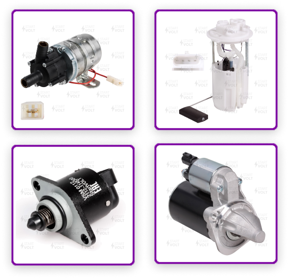 - Стартеры, генераторы и комплектующие, катушки зажигания, свечи накаливания, автомобильные датчики и элементы топливной системы.
